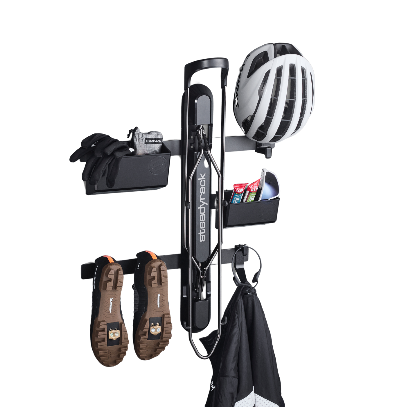 With three different bin sizes, hooks and hook and loop straps, store all your bike accessories neatly right next your bike.