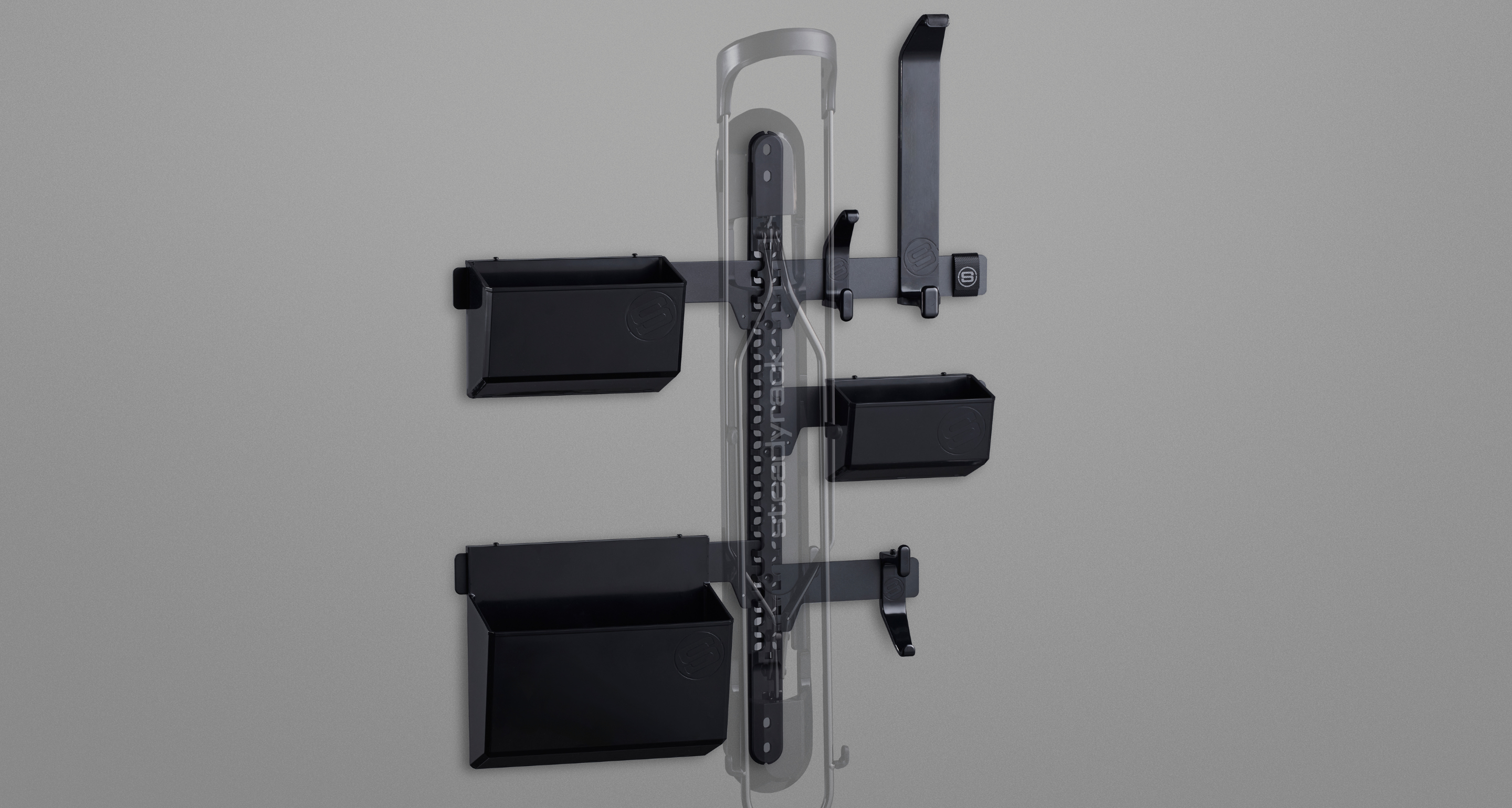 The Steadyrack Team have spent the last eighteen months perfecting our new product to ensure it was flawless. It was trial and error: concepts were created, prototypes tested, designs refined, and more concepts were created, and more prototypes tested - you get the idea. With a sleek combination of hooks, bins, and adjustable straps, GearMate lets you arrange your accessories your way. Fully customisable with over 200 arrangements, it adapts to suit your setup and style. Designed to install seamlessly behind your Steadyrack, its sturdy spine supports brackets to hold all your essentials.